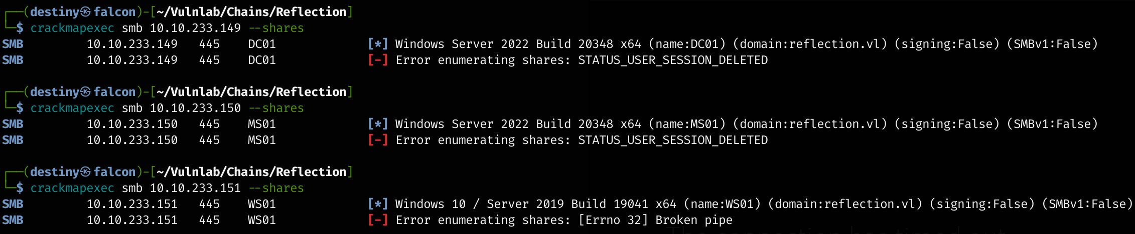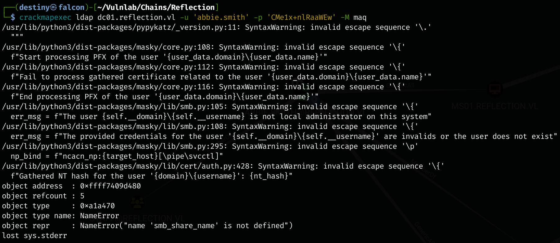 impacket-ntlmrelayx, targeting hosts in dc01.reflection.vl with SMBv2 support, but the attempt failed. - Tried the