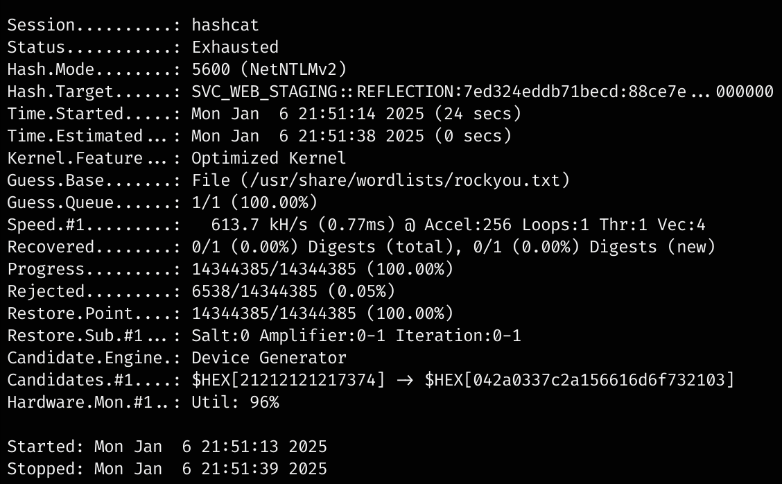 svc_web_staginguser. - Tried cracking the hash with Hashcat but failed.