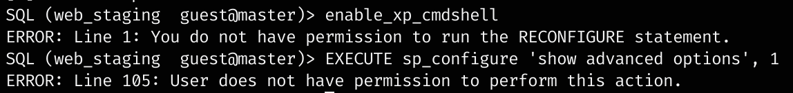 MS01using theweb_stagingcredentials withimpacket-mssqlclient. - Unable to enable
