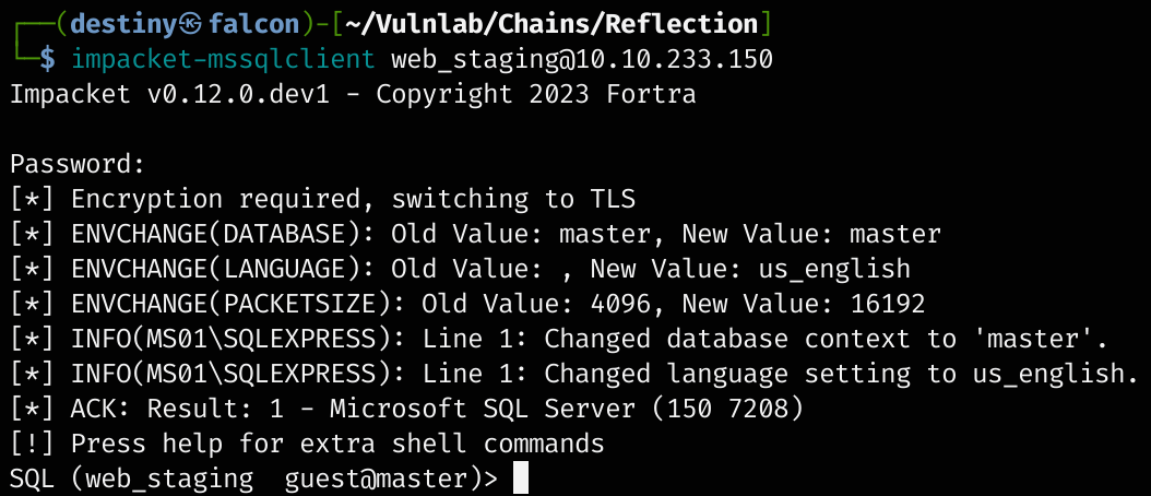 We were also able to log in to the MSSQL service using the credentials with impacket-mssqlclient.