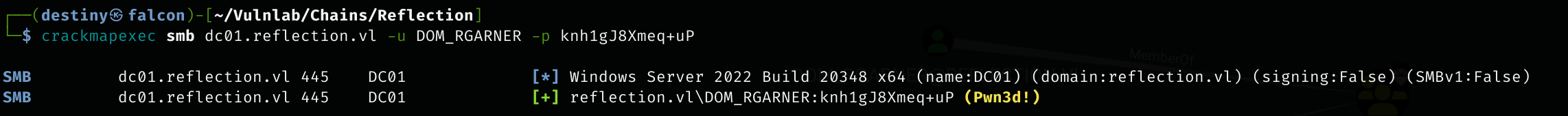 DOM_RGARNERwas a domain admin. - Verified the credentials for the DC using CrackMapExec and confirmed access as an administrator.