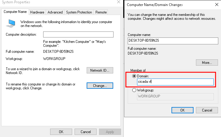 - To join the machine to the domain, navigated to Control Panel > System and selected Rename this PC (Advanced).