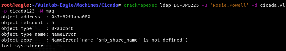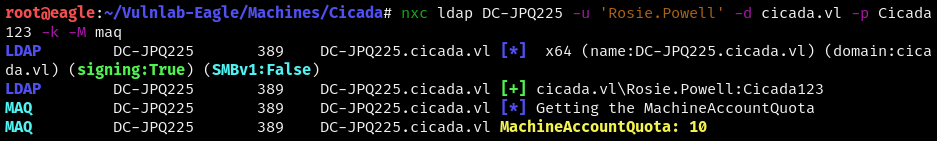 nxc ldap DC-JPQ225 -u 'Rosie.Powell' -d cicada.vl -p Cicada123 -k -M maq