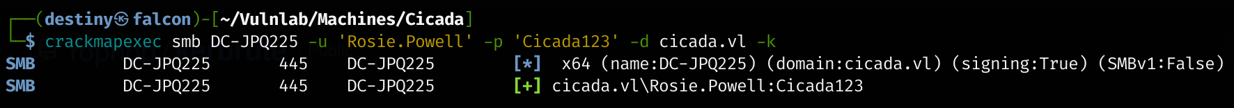 └─$ impacket-getTGT cicada.vl/Rosie.Powell@DC-JPQ225
