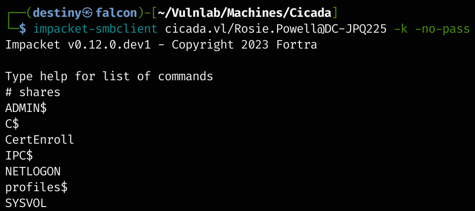 impacket-smbclient cicada.vl/Rosie.Powell@DC-JPQ225 -k -no-pass