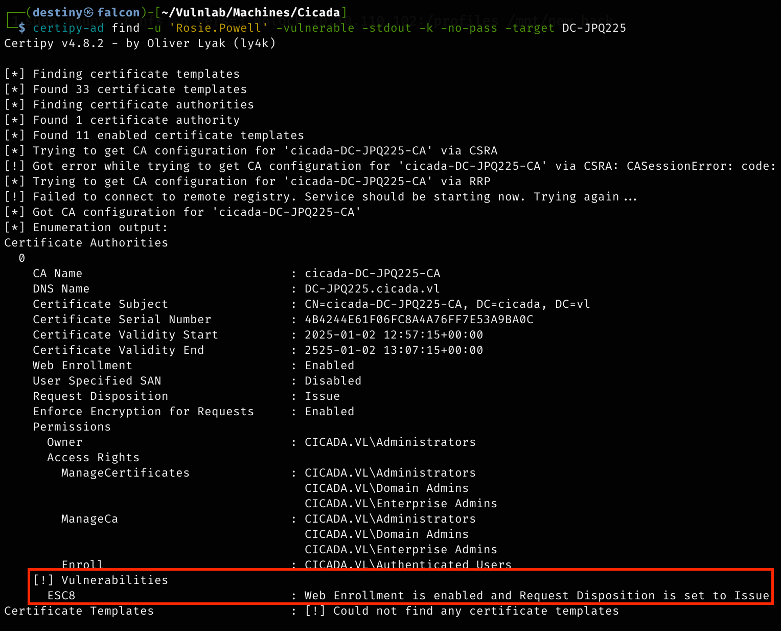 CertEnrollSMB share, indicating that the server was running Active Directory Certificate Services (ADCS). - Enumerated enabled and vulnerable certificate templates through certipy using the exported TGT.