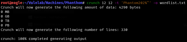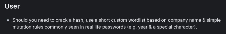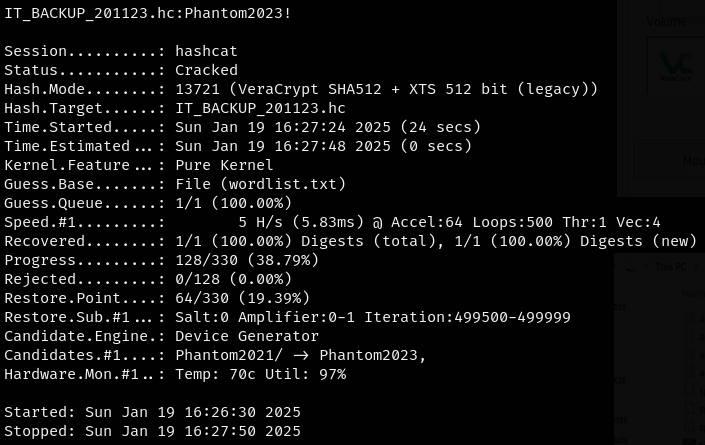 The .hc extension indicated that it was a file from VeraCrypt software, which encrypts data. This password could be cracked with Hashcat, but it wasn’t found in the rockyou.txt wordlist. So, we generated a custom wordlist using the company name, year, and a special character, as mentioned in the hint from the VulnLab Wiki.
