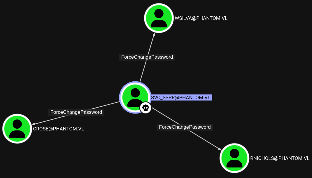 Analyzing the BloodHound data, we noted that our user had the ability to change the passwords of three users.