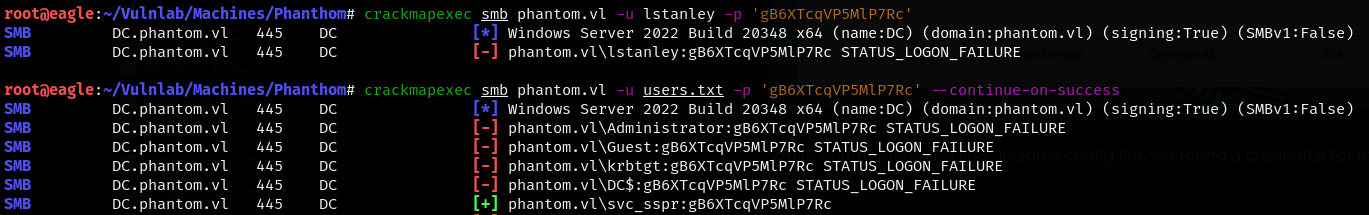 We used CrackMapExec to verify the credentials, but they didn’t work for that user. So, we performed a password spray and identified that the password worked for the user svc_sspr.