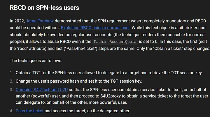 - Using the modified user account, obtain a service ticket to itself on behalf of the administrator, then use S4U2proxy to get a service ticket for the target the user can delegate to.