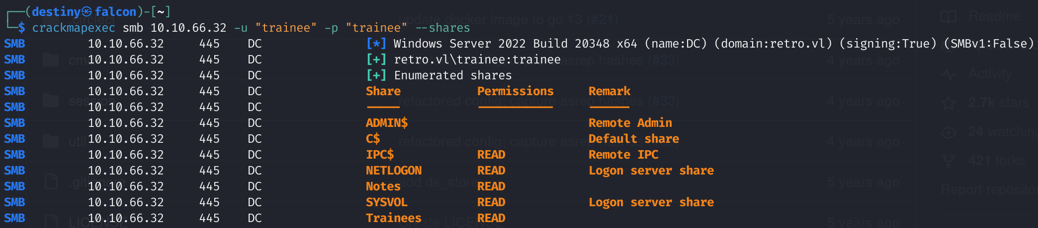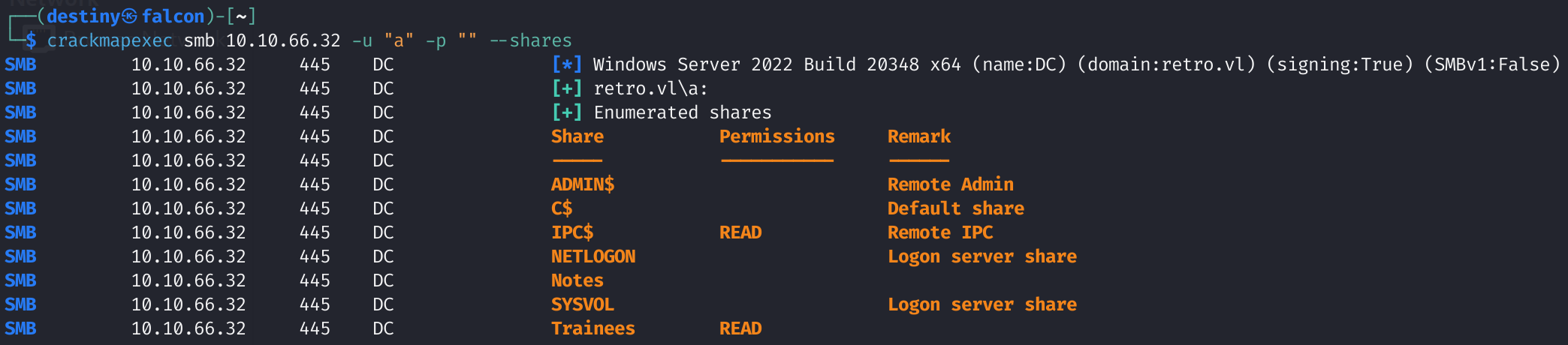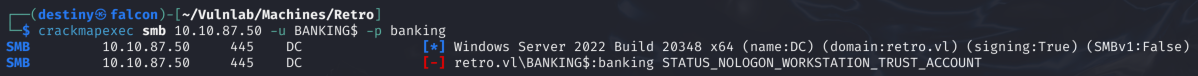 SMB retro.vl 445 DC [*] Windows Server 2022 Build 20348 x64 (name:DC) (domain:retro.vl) (signing:True) (SMBv1:False)