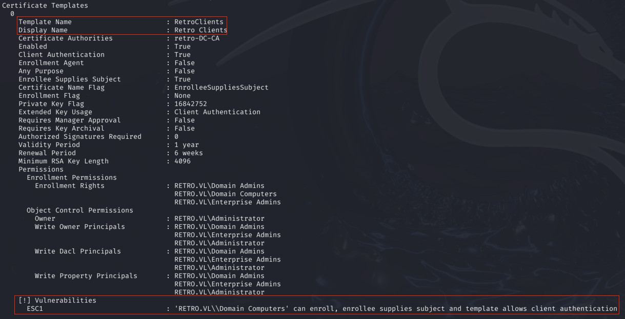 We used certipy to check vulneable certificates and was able to see that the certicifiacte template RetroClients is vulnearbal to an ESC1 attack :