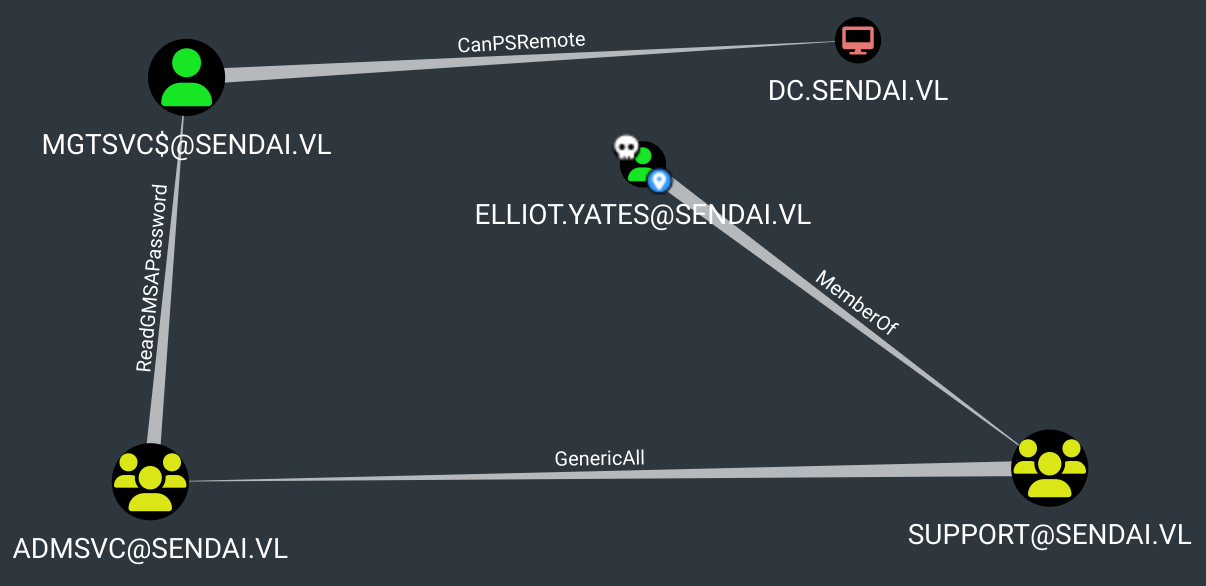 bloodhound-python -d 'SENDAI.VL' -u 'Elliot.Yates' -p 'Password@123' -ns 127.0.0.1 -dc dc01.sendai.vl -c all