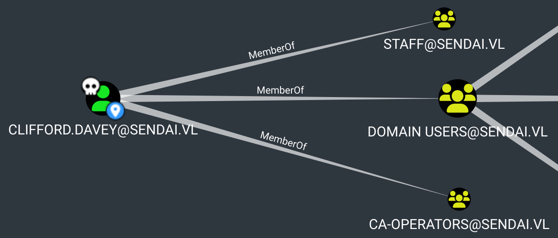 While looking at the BloodHound graph, we were able to see that the clifford.davey user is a member of the CA_OPERATORS group.