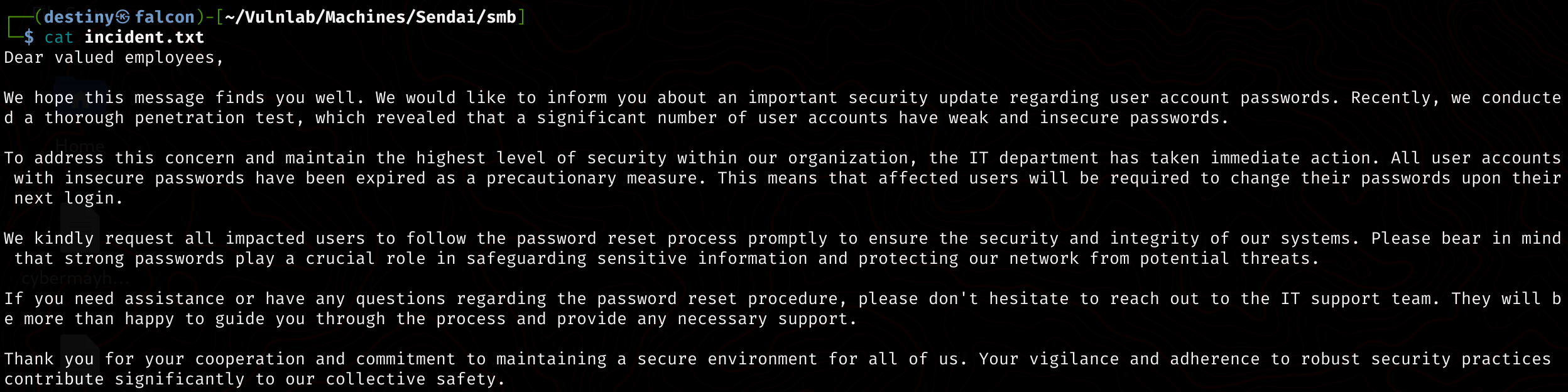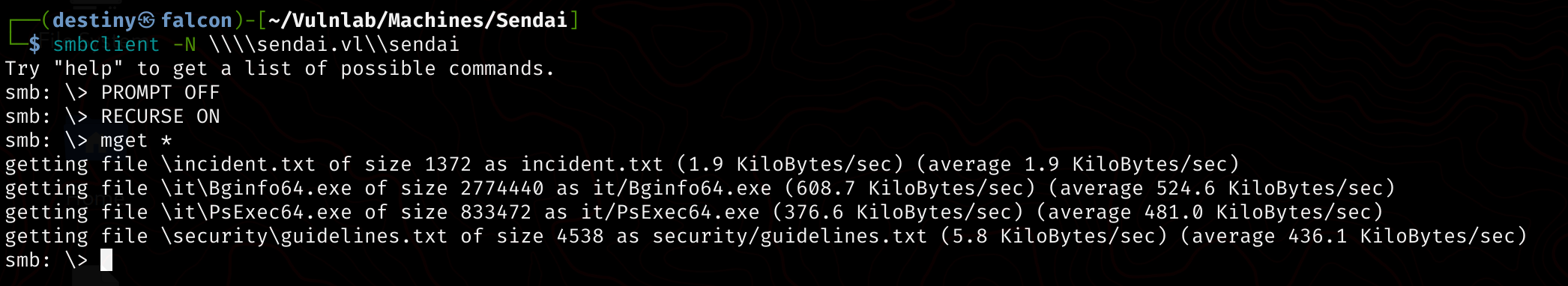 IPC$,sendai, andusersshares. - Downloaded all accessible files to Falcon for further enumeration and started analyzing the files.